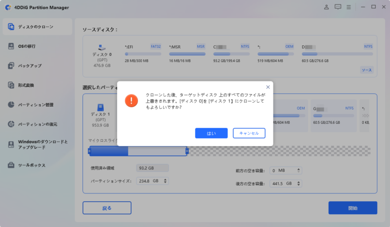 ↑クローン先のディスクのすべてのデータを上書きするので良ければ【はい】をクリックします。