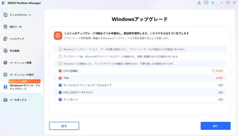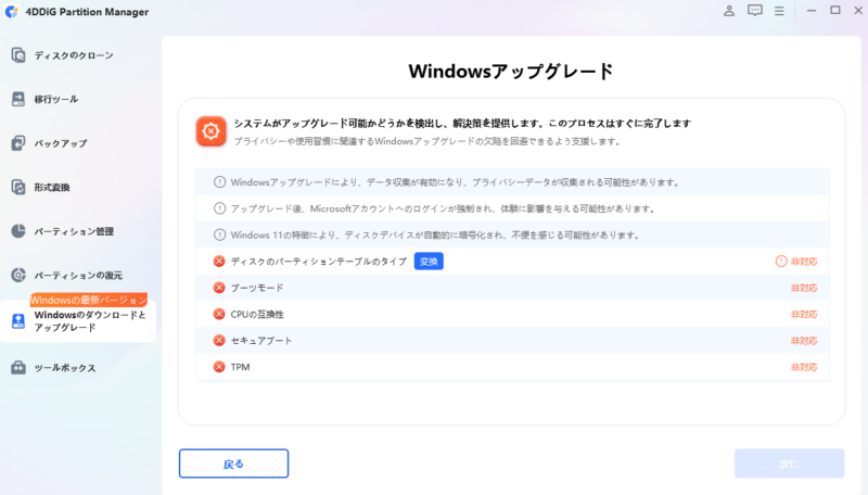 ↑HDDやSSDの形式をGPT形式にしたり、対処法が何点か表示されるので改善したら【次に】をクリックしてWindows11にアップデートできます。