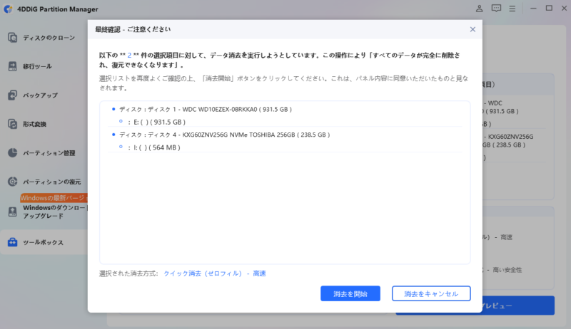 消去を開始するとすべてのデータが復元不可能になり、完全に削除されます。