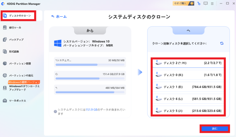 PCに接続されているHDDやSSDが表示されるので画像赤枠のクローン対象の保存先フォルダーを選択します。