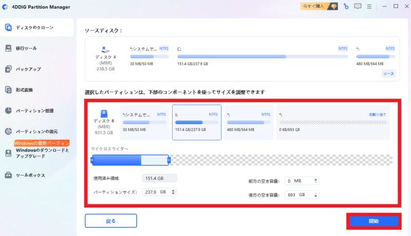 たとえば上の画像だと、コピー元が238GB、コピー先が931GBの場合はクローン後に残る未割り当て領域(693GB)をどれ暗い使うかをこのスライダーで調整できます。 スライダーを右に動かせばIドライブの容量を931GBいっぱいまで広げてクローンできます。
