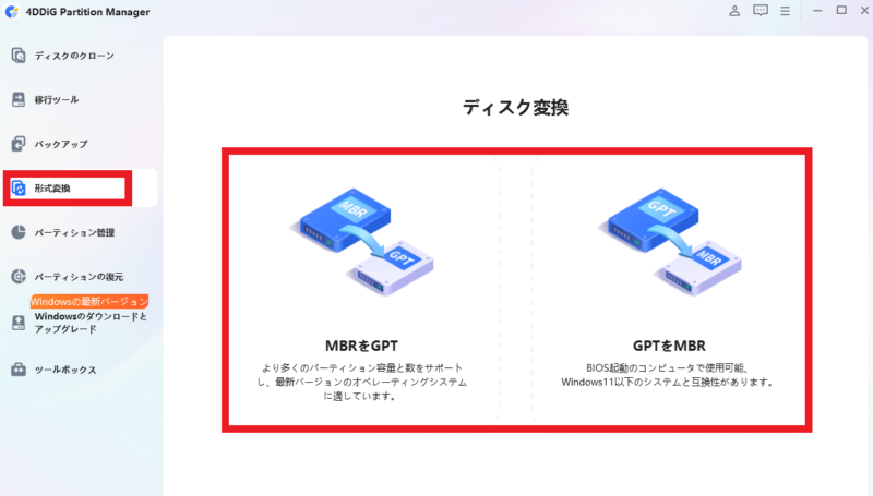 ↑MBRとGPT形式変換をしたい場合は【形式変換】タブから形式を変換可能です。