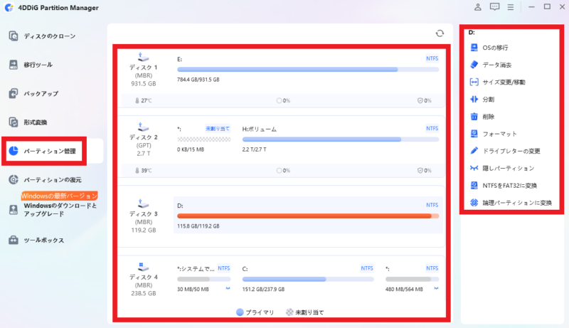 ↑この画面が4DDiG Partition Managerのメイン操作画面です。
