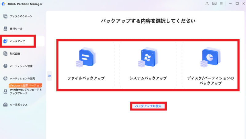 ↑HDDやSSDのファイルやOSなどをバックアップしたい時は【バックアップ】タブからデータをバックアップ可能です。