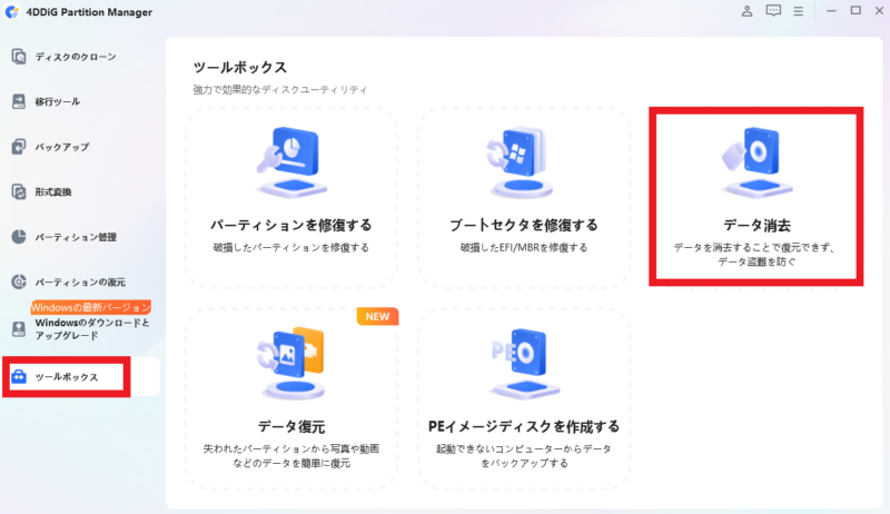 SSDやHDDのデータを完全に消去したい場合は画像赤枠の【ツールボックス】→【データ消去】をクリックします。