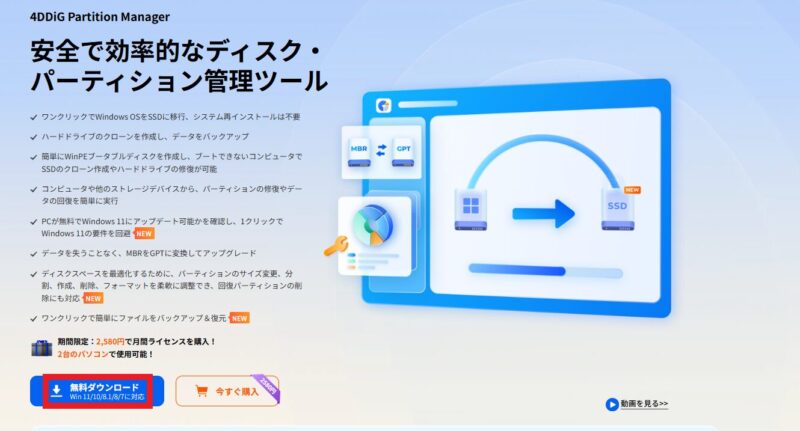↑まずは4DDiG Partition Manager公式サイトの【無料ダウンロード】をクリックして無料でダウンロードします。