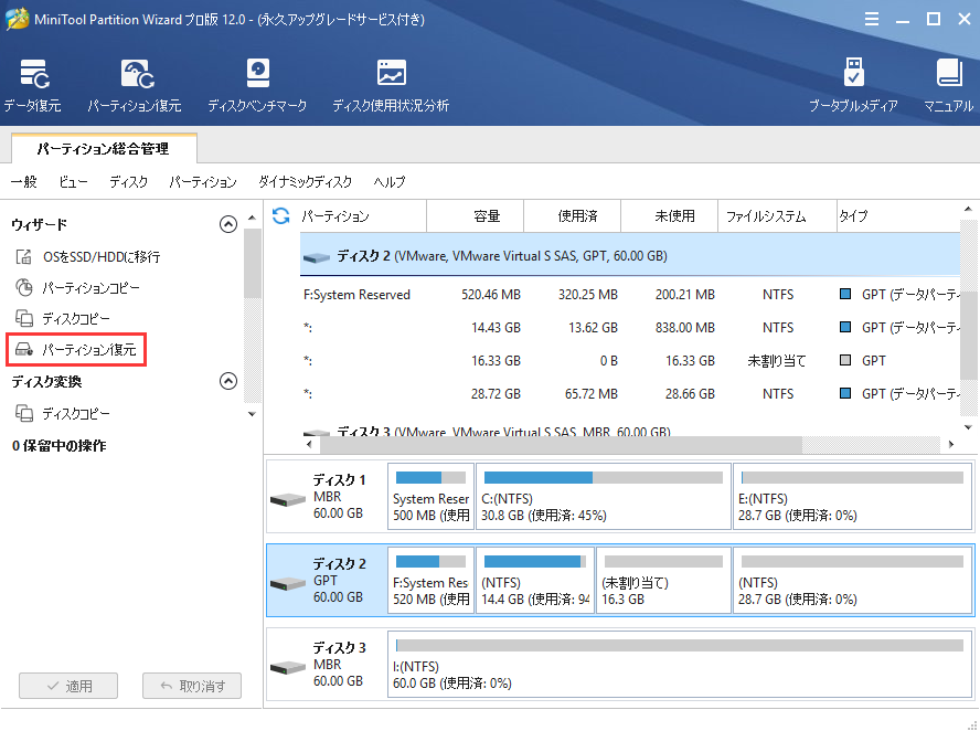 - MiniTool Partition Wizardの「パーティションの復元」機能はパーティションの紛失に対処でき、紛失したパーティションとデータを同時に復元できます。