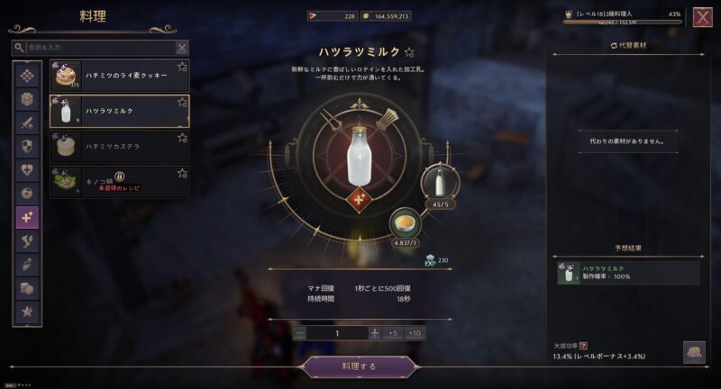ハツラツミルクなどの即時回復アイテムも他の種類の料理を食べてても18秒間HP回復の効果が付きます。