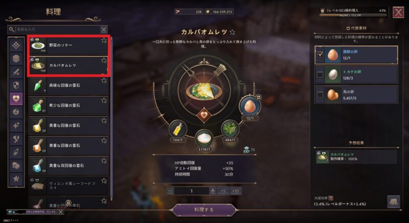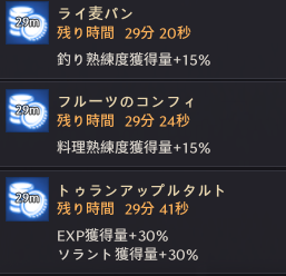 ↑釣りや料理熟練度、EXP、ソラント獲得量アップは何個も食べた結果、3種類とか何個も重複可能でした。