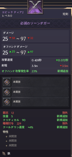 | 必滅のソーンダガー | 25~97 | 0.428秒 | 3.5m | 技量5 | クリティカル90 | クールダウン速度+4% | ||