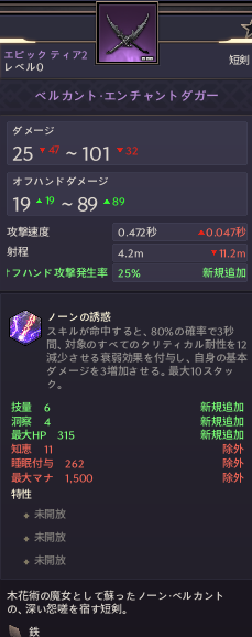 ベルカント・エンチャントダガー25~1010.47秒4.2m技量6洞察4最大HP315※7ノーンの誘惑