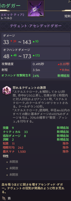 テヴェント・アセンデッドダガー33~1430.49秒3.5m技量9洞察2クリティカル33追加ダメージ8※11怒れるテヴェントの激昂