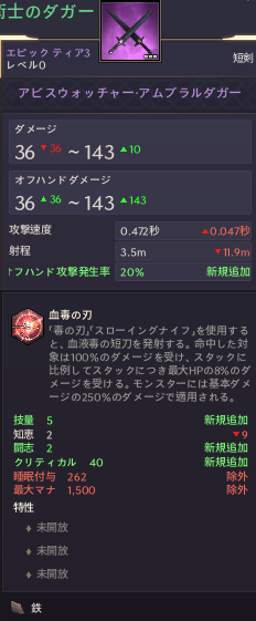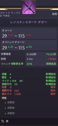 特級レジスタンス・ダガー22~830.472秒3mクリティカル140衰弱付与142