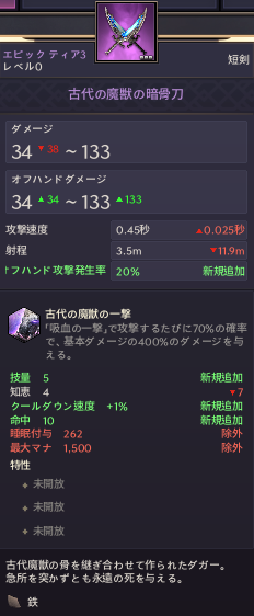 古代の魔獣の暗骨刀34~1330.45秒3.5m技量5知恵4命中10クールダウン速度1%※12古代の魔獣の一撃
