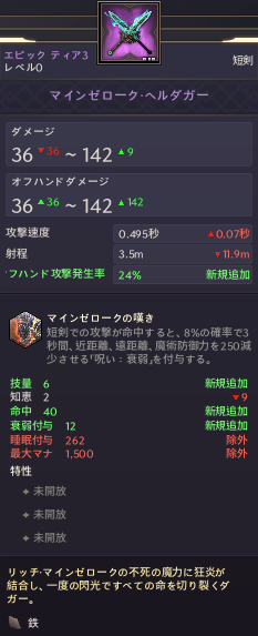 マインゼローク・ヘルダガー36~1420.49秒3.5m技量6知恵2命中40衰弱付与12※13マインゼロークの嘆き