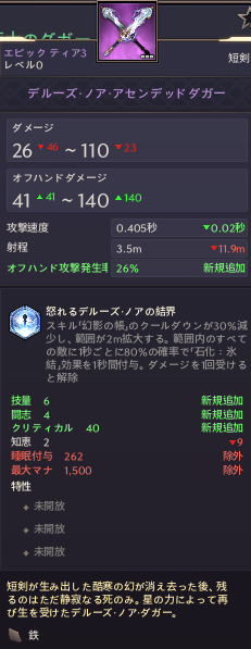デルーズ・ノア・アセンデッドダガー26~1100.4秒3.5m技量6知恵2闘志4クリティカル40※15怒れるデルーズ・ノアの結界