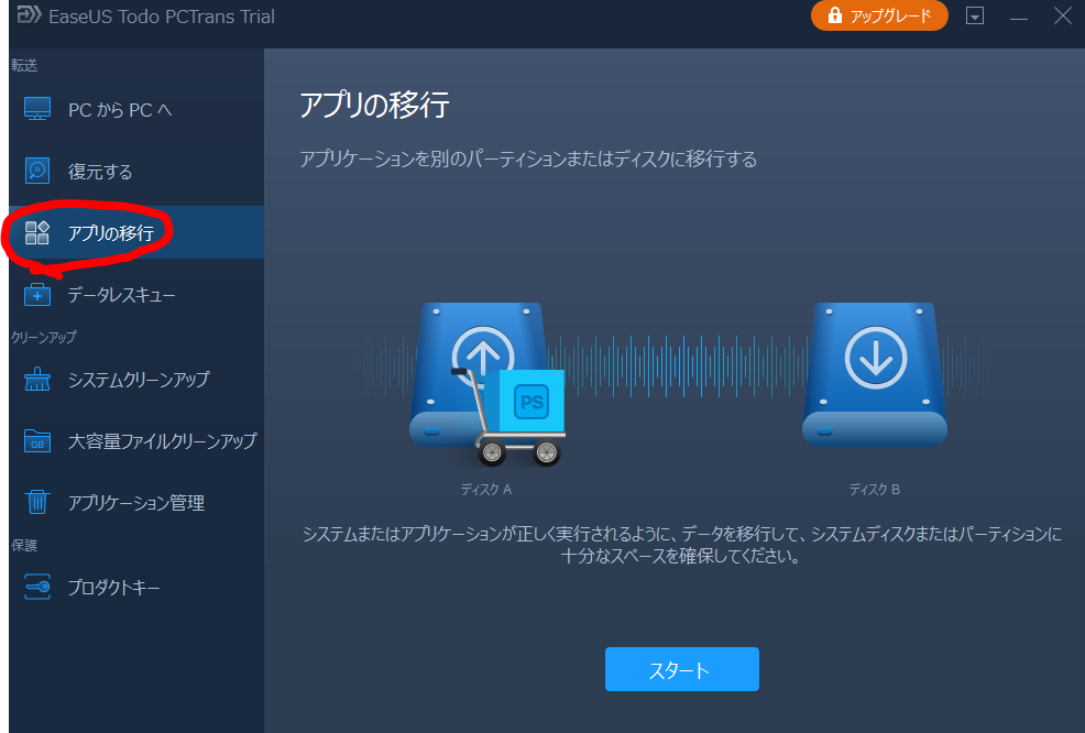 ↑こちらがEaseUS Todo PCTransのメニュー画面になります。
