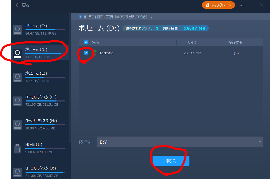 転送したいアプリを選んで転送で、アプリ移行できる。