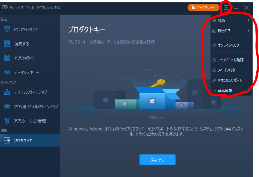EaseUS Todo PCTransのメニュー画面
