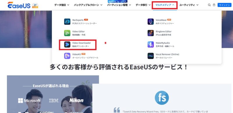 ↑まずはEaseUS Video Downloader公式サイトのマルチメディアのところからVideo Downloaderを選択します。