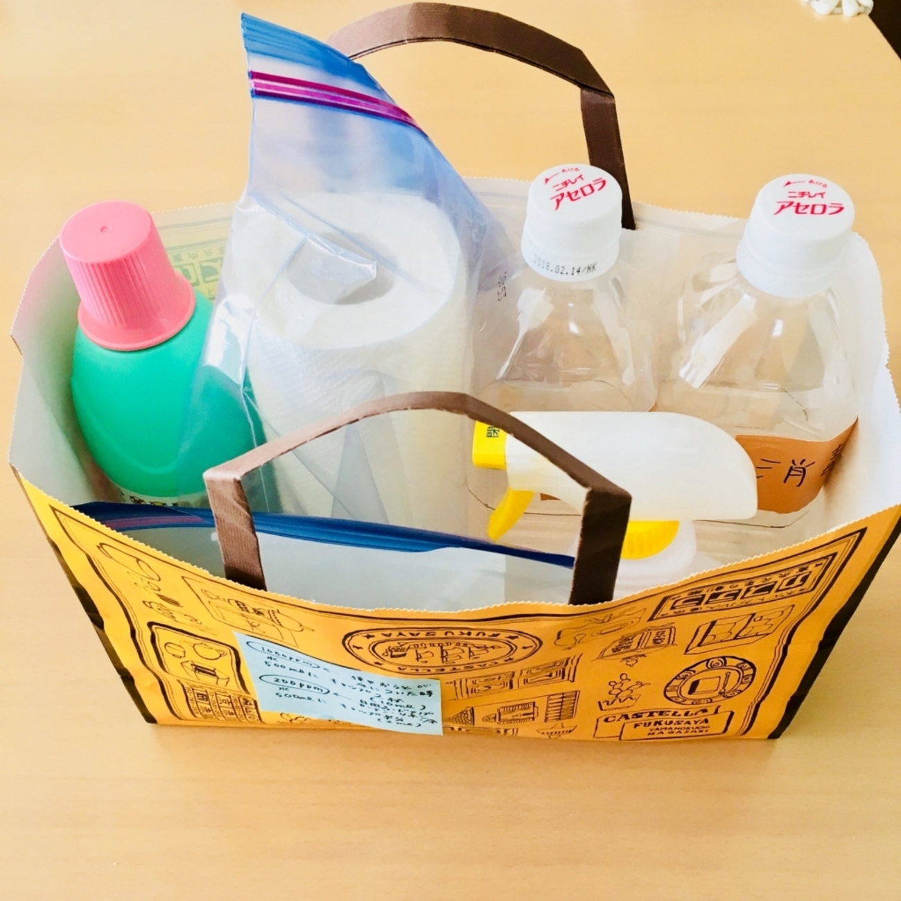 スプレーボトルに水を入れて、ブリーチ(ハイターでも可)をキャップ1杯小で消毒液が作れる。(机やドアノブやキッチンの消毒などに)