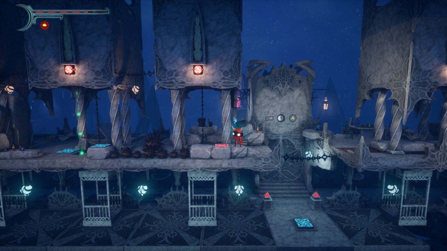 この像みたいなところに行ってL2ボタンを押すと画像左上の体力が回復します。体力は落下したり、罠に当たったり、敵に当たると下がっていきます。スキルや音楽なども変更できるようです。