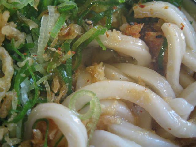 すこし食べると、天カスの油がうどんの汁に溶け込んでおいしい~!さらに生姜とネギと唐辛子の風味もうどんと全て混ざって一体となって美味しいです!まさに ザ・うどんじゃ~!