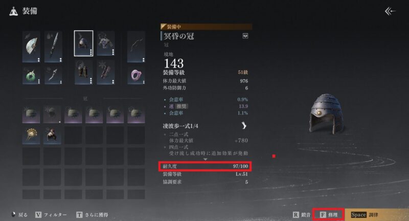 ↑装備をずっと装着していると耐久度が減っていくので右下の修理を選択すると修理できます。