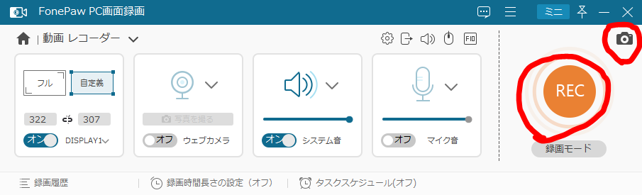 こちらがFonePaw PC画面録画のメニュー画面だ。