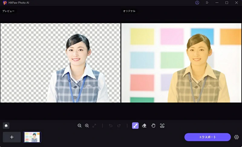 ↑写真をアップロードすると自動的にAIで読み取って背景を削除しますが、筆のアイコンで削除したい箇所を自分で選択して背景削除も可能です。エクスポートをクリックで背景削除した画像を保存します。