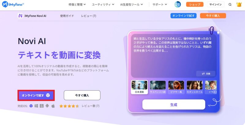 ↑まずはNovi AI公式サイトで【オンラインで試す】をクリックします。