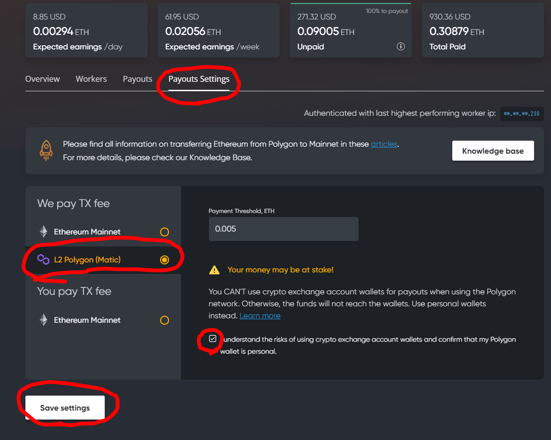 次に↑画像赤丸のPayouts SettingsのL2 Porygon(MATIC)をクリックします。(最低出金額は0.005ETHです。)