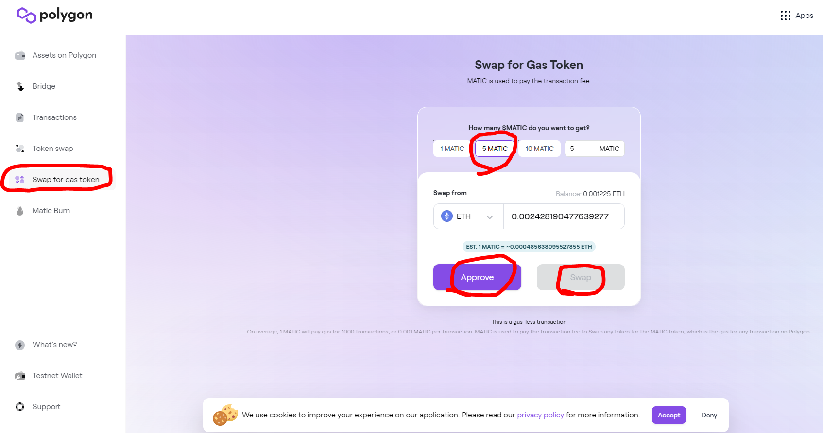次に手数料(ガス代)にMATICを使用するのでMATICを何枚か入手します。Polygon wallet のSwap for gas tokenの↑画像赤丸のところでMATICを何枚か交換します。Approveをクリックして、Swapをクリック。