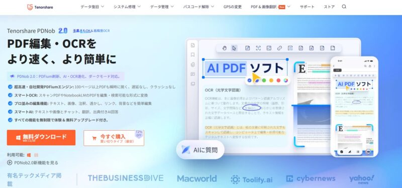 Tenorshare PDNob 2.0は編集・変換・AIまで一体化し、無料でも試用できますが有料でもコストパフォーマンスが高いオールインワンPDF編集ソフトです。