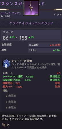 堕天使の避雷針99~1420.7秒17.6m技量3知恵5クールダウン速度+3%種族ダメージアップ16※9電撃の槍