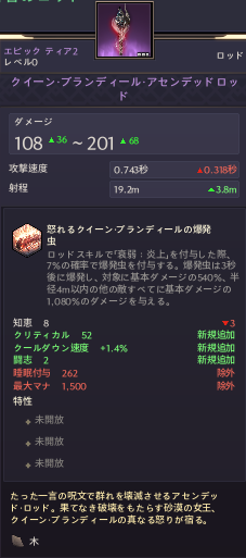 • ※4クイーンブランディールの爆発虫 ロッドスキルで衰弱 : 炎上を付与した際、5%の確率で爆発虫を付与。爆発虫は3秒後に爆発し、対象に基本ダメージの540%、半径3m内の他の敵すべてに基本ダメージの1,080%のダメージ