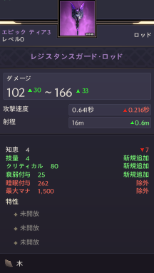 レジスタンスガード・ロッド102~1660.64秒16m技量4知恵4衰弱付与25クリティカル80