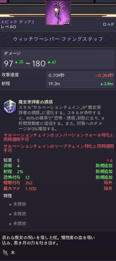 ウィッチワーシパー・ファングスタッフ97~1800.7秒19.2m知恵5洞察4恐怖付与12射程2%※12魔女崇拝者の誘惑