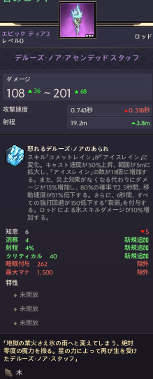 デルーズ・ノア・アセンデッドスタッフ108~2010.74秒19.2m知恵6洞察4クリティカル40射程4%※15怒れるデルーズ・ノアのあられ