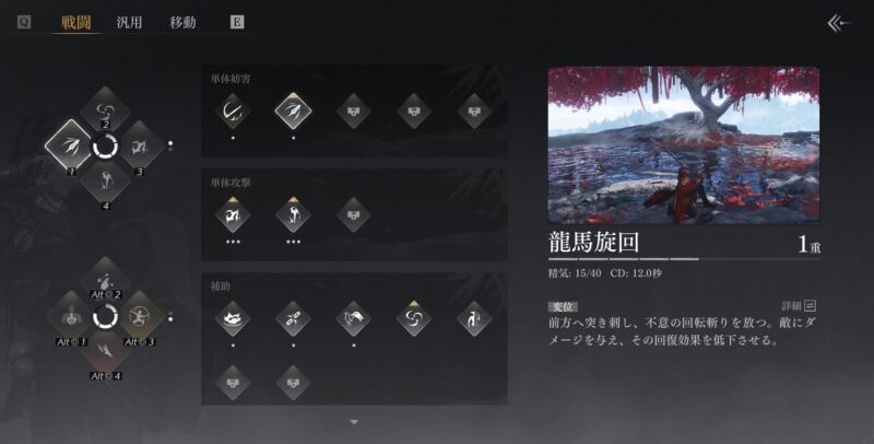 ↑龍馬旋回は精気15/40 CD 12.0秒で 前方へ突き出し、回転切りを放ち、回復効果を低下させる効果があります。