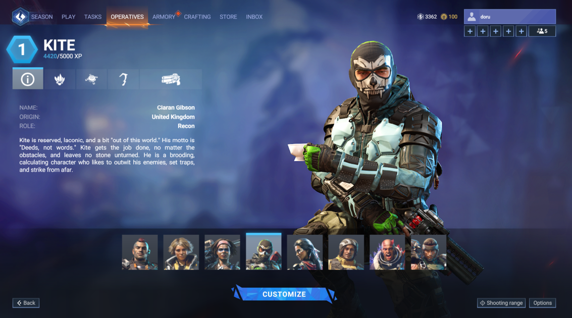 タイトルメニュー画面OPERATIVESで装備変更、キャラクターの外見変更や武器の外見変更など可能、XPを貯めて装備アンロックも可能だ。