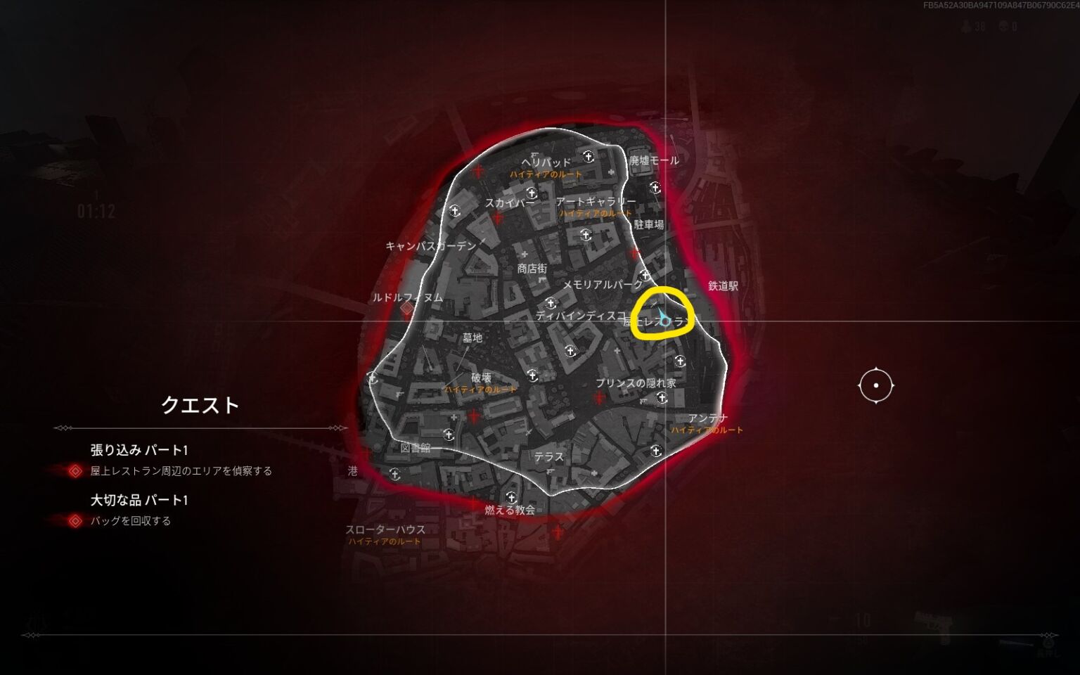 張り込みパート1のクエストの【屋上レストラン周辺のエリアを偵察する】の場所。