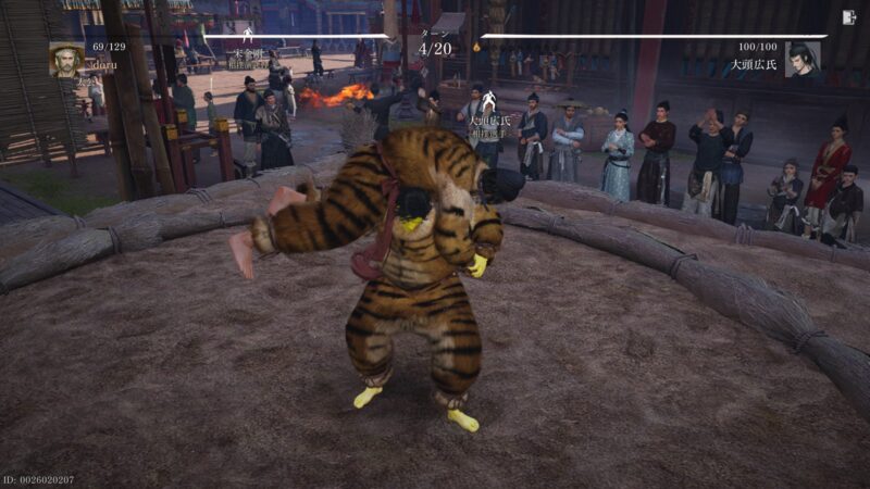 ↑オンラインでのプレイヤーとの相撲とは違って、NPCとの相撲は金剛投げが有効で、金剛投げが決まると一発で勝利になります。