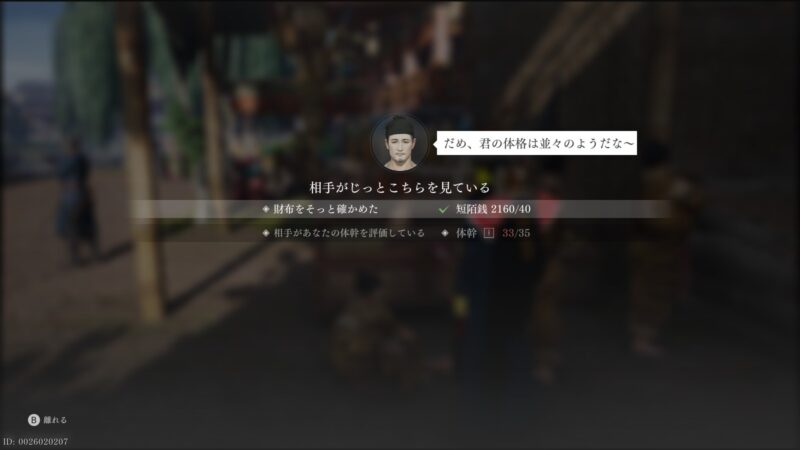 ↑相撲の勝負できるNPCは3人いますが、話しかける相手によって難易度が違い、簡単は体幹20、普通は35、困難は50の体幹が必要です。