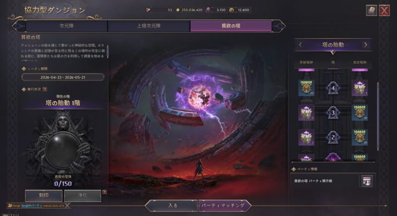 この貪欲の塔はメニューの【協力型ダンジョン】から申請できる協力型PvEダンジョンで、ソロからパーティーまで対応しており、キャラクターの強化(アーティファクトの強化など)に欠かせない報酬が手に入ります。
