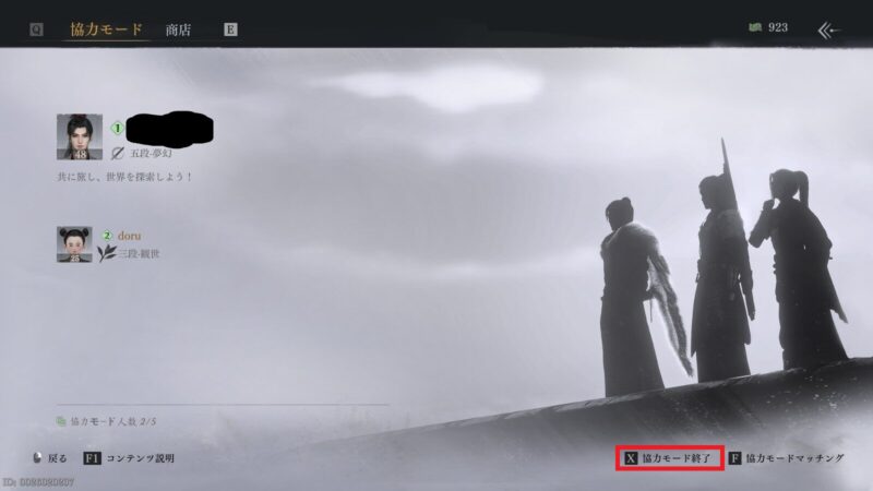 ↑画像赤枠の退出のマークを選択すると協力モードを退出して終了可能です。
