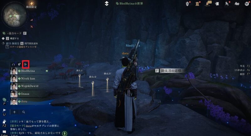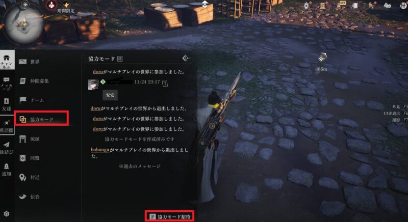 ↑自分から他のプレイヤーを募集するときはチャット欄から協力モード招待をクリックして募集開始可能です。